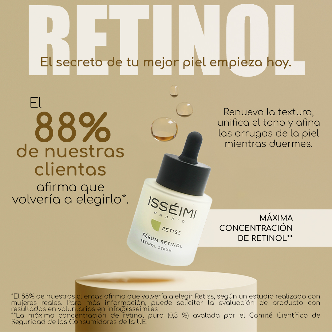 El Sérum Retiss, formulado con Retinol puro, actúa durante la noche realizando un suave efecto peeling que mejora la textura de la piel, difumina arrugas y líneas de expresión, y potencia la firmeza y elasticidad del rostro.